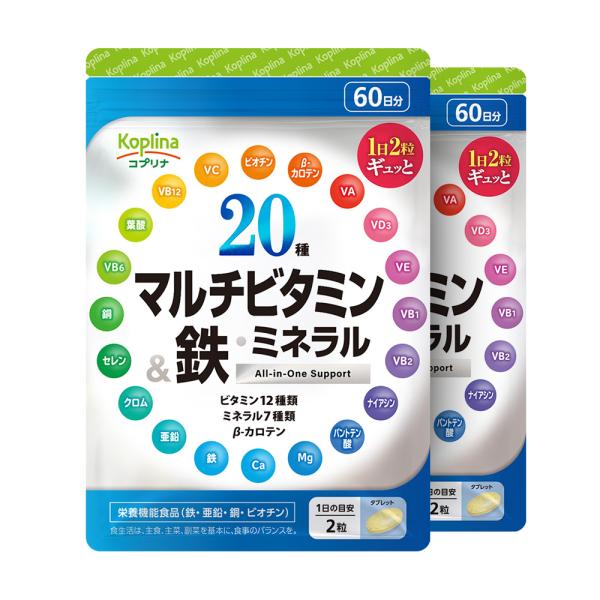\53%OFF/20種マルチビタミン&鉄・ミネラル 120粒 2袋120日分(つるっと飲みやすい/栄養機能表示食品/鉄分強化配合/健康/サプリメント)
