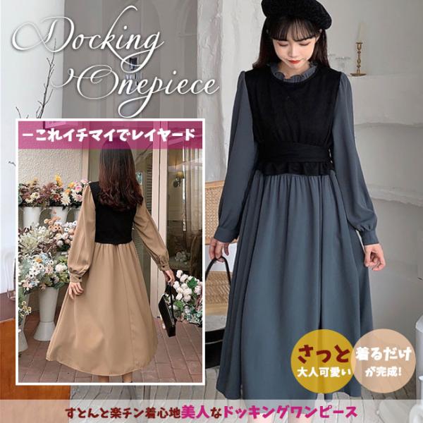 商品名:イチマイでレイヤード ドッキングワンピースワンピース 春夏秋冬 長袖 フレア ロング丈 ワンピース ワンピ おしゃれ 着やせ 切り替え あったか■デザイン・シルエット『さっ...