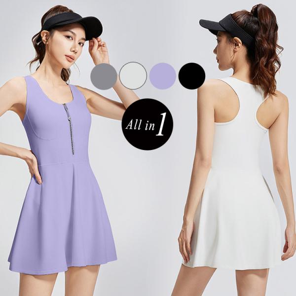 メール便送料無料 スポーツウェア ワンピース レディース フィットネスウェア ヨガウェア タンクトップ ノースリーブ ハーフジップ ストラップ ショートパンツ一体型 カップ一体型 ア...