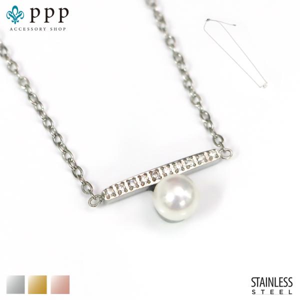 ステンレス ネックレス (116)パール CZ 選択可 (銀色 金色 ピンクゴールド) ジルコニア シルバー ピンク レディース