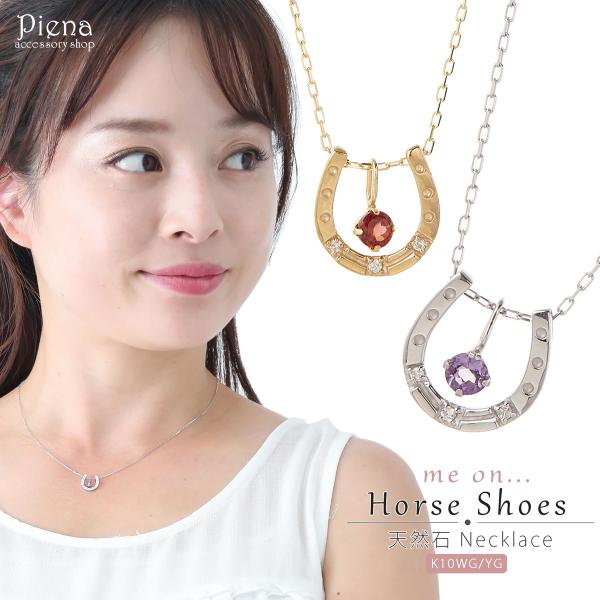 ネックレス レディース K10 10金 ホースシュー 蹄鉄 誕生石 天然石 幸運のシンボル ラッキーモチーフ お守り アズキチェーン アジャスター付 長さ調節可能 専用BOX付 揺れる 煌びやか キ...