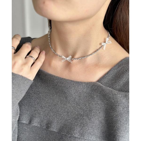 ネックレス ポイントリボンビーズチョーカーネックレス-point ribbon beads choker necklace- レディース