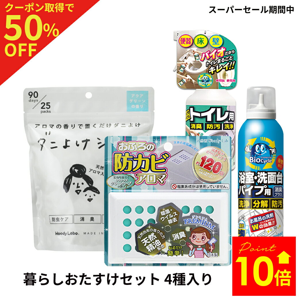 【50%OFFクーポン取得で¥2,805-&P10倍中:楽天スーパーSALE】 【公式】 暮らしおたすけ セット バイオサイクル 泡 パイプ用 トイレ用 洗剤 おふろの防カビプレミアム ダニよけシリカ 白 掃除セット 洗剤セット 家中掃除 掃除道具