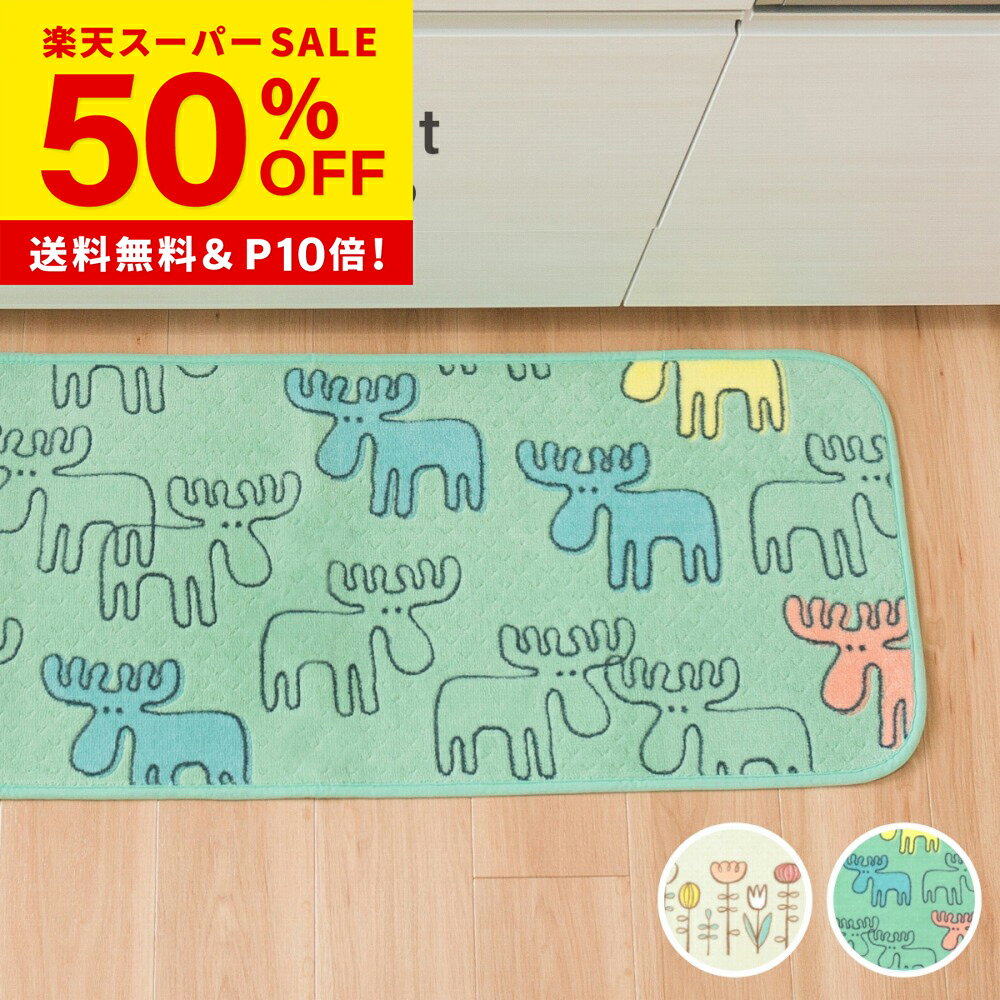 【50%OFF★12/4 20時〜】エルクパーク・クッカ 北欧プリント キッチンマット 約45cm×240cm (キッチン マット おしゃれ 北欧 かわいい プリント 240cm 洗える ウォッシュブル マット フィンランド 花 ヘラジカ エルク プレゼント )