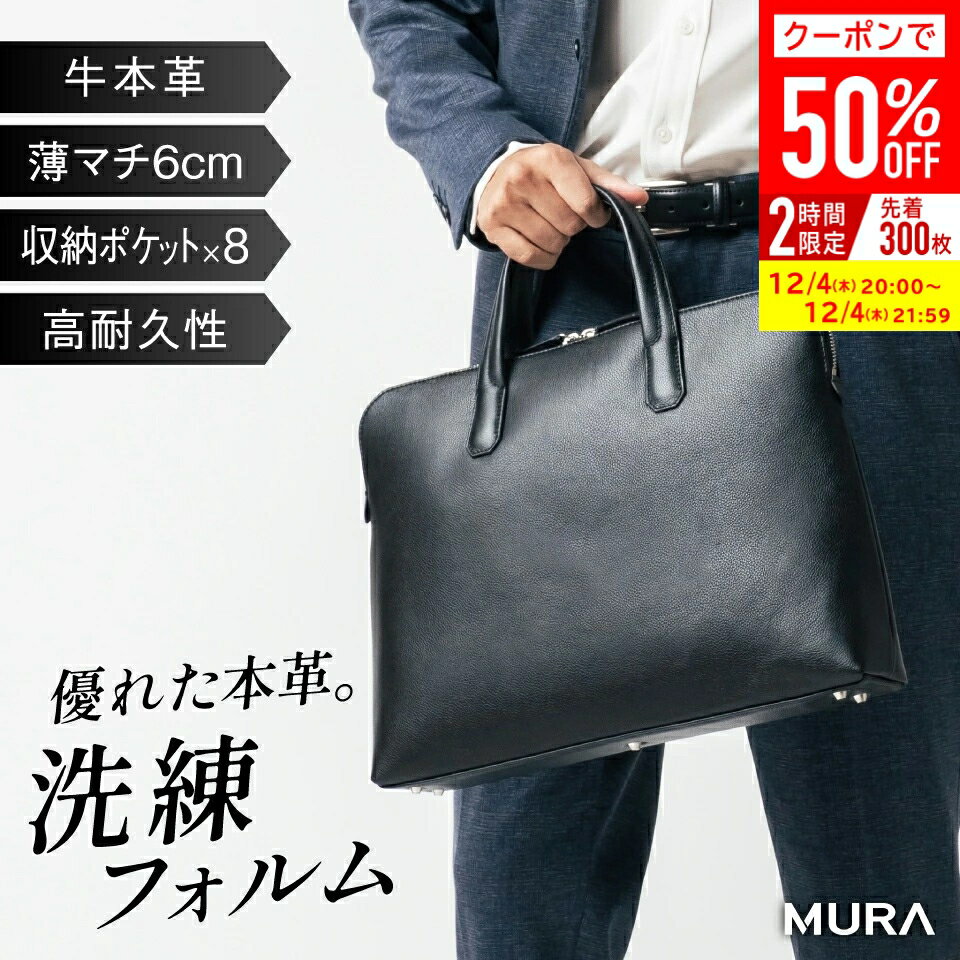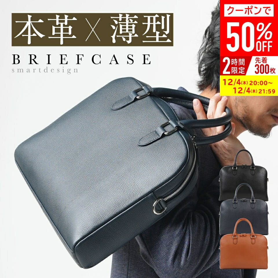 \クーポンで50%OFF♪/【6cm薄マチで軽快通勤】 本革 メンズ ブリーフケース 牛本革 日本製YKKファスナー A4/B4 PC収納 薄型ダブルジッパー 軽量 軽い ポケット付き 大容量 自立 通勤 出張 ビジネス ギフト プレゼント シュリンクレザー おしゃれ シンプル コンパクト