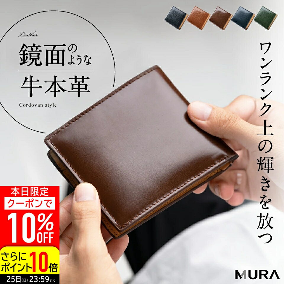 \クーポンで50%OFF♪/ 【薄さ×大容量でスマート管理】 本革 二つ折り財布 メンズ コードバン調 牛本革 牛革 薄型 大容量 カード収納 ボックス型 小銭入れ 日本製 スナップ式 薄型 薄い スリム 折りたたみ 高級レザー ギフト プレゼント 一粒万倍日 金運 MURA公式