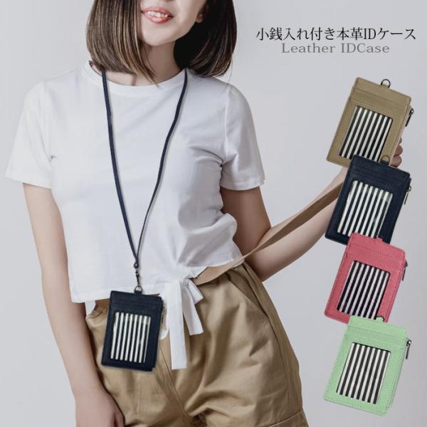 本革 IDカードホルダー 縦型 パスケース idケース カードケース スリム 首かけ 小銭入れ 社員証 薄い 両面 透明窓 ネームホルダー パスケース ネックストラップ