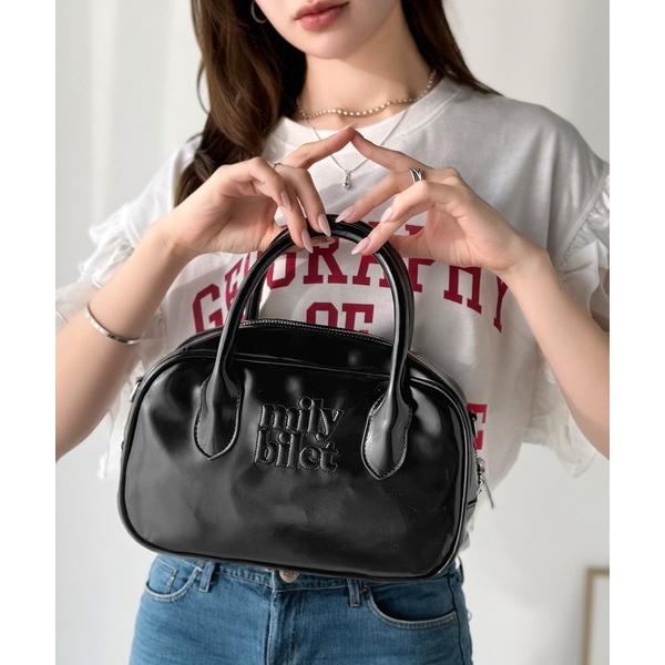ハンドバッグ 「mily bilet」ヘビロテしたい主役級バッグ。エナメルライクエコレザーエンブレムミニボストンバッグ