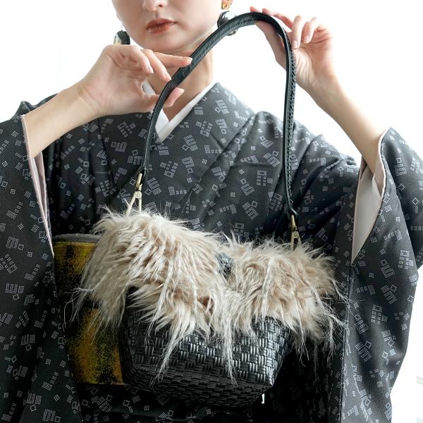 ファー付ミニトートバッグ 羊革×ラフィア ブラック×ブラウンテリア フェイクファー かごバッグ 和装 和服 カジュアル 個性派 モード 和装バッグ 洋服にも
