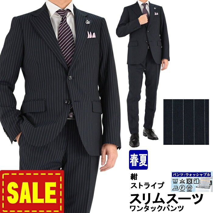 【SALE50%OFF】 スリムスーツ メンズスーツ 紺 ストライプ ナロースーツ 即日出荷 秋 春夏 スーツ テーパード ワンタックパンツ 洗える 家庭洗濯 パンツウォッシャブル 1MA902-21