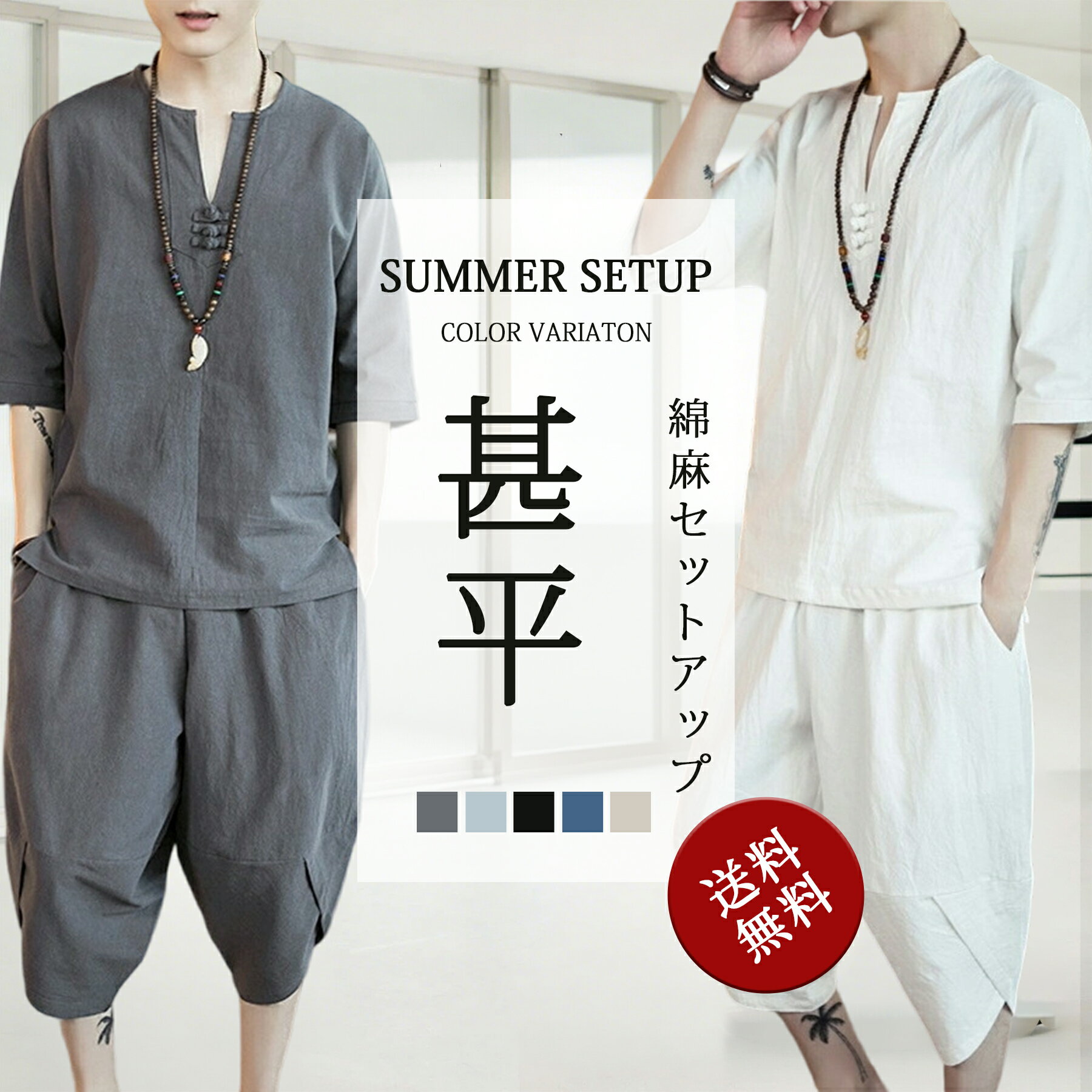 【50%OFFクーポン】[Mirroryou] 送料無料 甚平 メンズ tシャツ 七分袖 部屋着 ルームウェア 大きいサイズ 亜麻上下セット じんべい パジャマ 夏 リネン 涼しい 綿 カジュアルセットアップ メンズ 父の日 ワイドパンツ サルエルパンツ 2点セット 七分袖 プレゼント ギフト