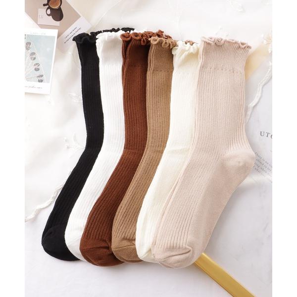 靴下 「6足セット」選べる丈2タイプ ソリッドカラー メロウ フリル リブ クルー ショート ソックス レディース