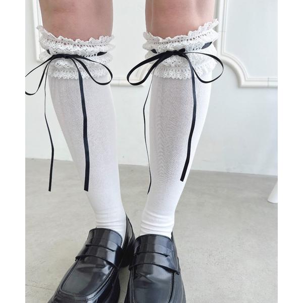 靴下 リボン通しトーションレースハイソックス レディース