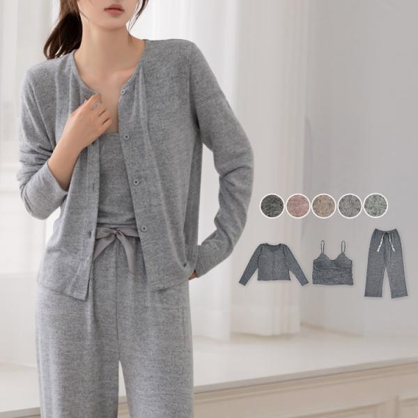 ルームウェア レディース 長袖 カーディガン キャミソール パッド入り クロップド丈 トップス パンツ 3点セット セットアップ 薄手 春秋