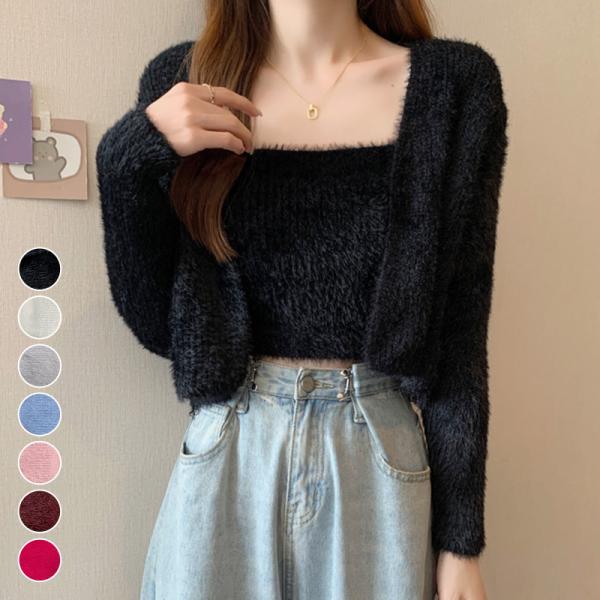 送料無料 翌日配達 あすつくかわいい シンプル フェミニン セクシー 重ね着 同色 スクエアネック ドロップショルダー ニットカーディガン キャミソール トップス 中厚手 袖リブ 前開き...