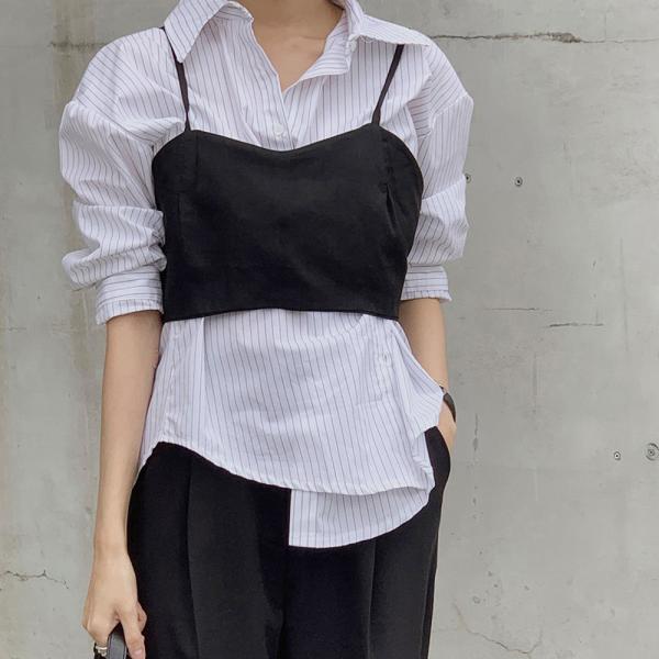 シャツ ビスチェ レディース 2点セット 春秋 長袖 ストライプ ブラウス トップス おしゃれ かわいい 韓国 きれいめ 白 黒
