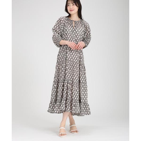 シャツワンピース インドコットン100% エスニック総柄 ティアード ロングワンピース / ナチュラル コットンワンピ