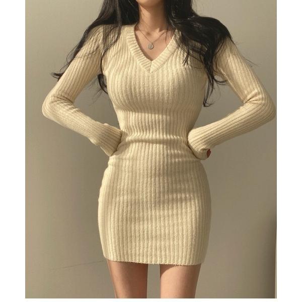 ワンピース Vネックリブ編みニットタイトミニワンピース