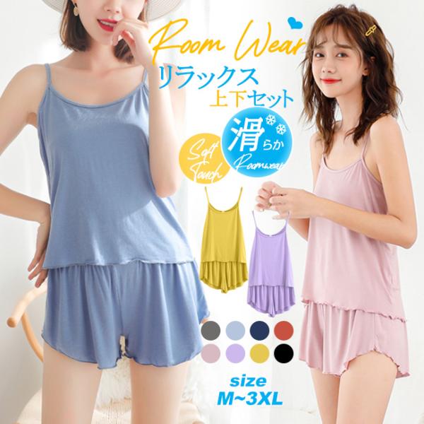 柔らかく伸縮性 カットソー 2点セットルームウェア レディース 女性 キャミソール ショートパンツ かわいい パジャマ ナイトウェ