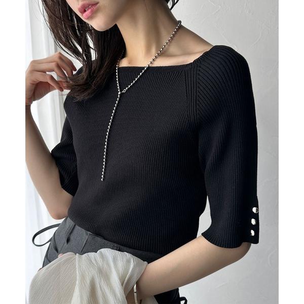tシャツ スクエアネック袖ボタンハーフスリーブリブニット レディース