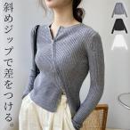 ニット トップス リブ カットソー レディース 長袖 クルーネック きれいめ スラッシュ ファスナー 無地 中厚手 黒 秋 冬