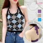 キャミソール ニットキャミソール 背中開き アーガイル タンクトップ ノースリーブ トップス インナー ホルターネック リボン フリーサイズ JOCOSA 7068