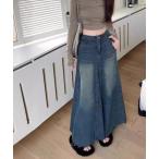 斜め切り替え×フリンジでお洒落リメイク風なデザインに◎ デニムスカート ロングスカート 女性 ジーンズ ヴィンテージ風 オールシーズン 体型隠し ベーシック 無地 普段着 シンプル...