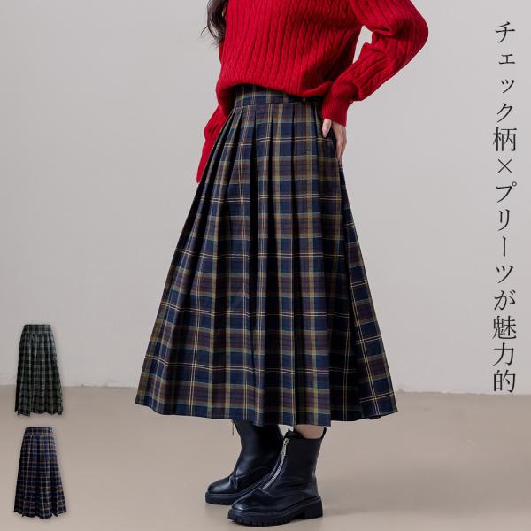 チェック プリーツスカート ロング レディース Aライン フレア きれいめ 膝下丈 チェックスカート ボトムス ハイウエスト 黒 秋 冬