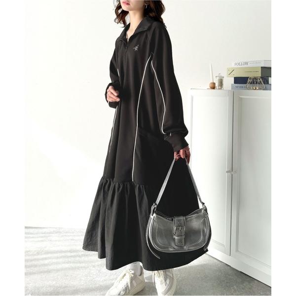 ワンピース スポーツMIIX!胸元刺繍入り異素材ドッキングハーフジップパイピングジャージワンピース(ロング丈)