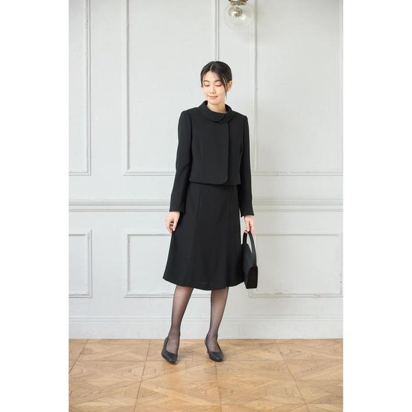 スカートスーツ 「WEB限定」2点セット ロールカラーアンサンブル ジャケット ワンピース 黒無地 通年