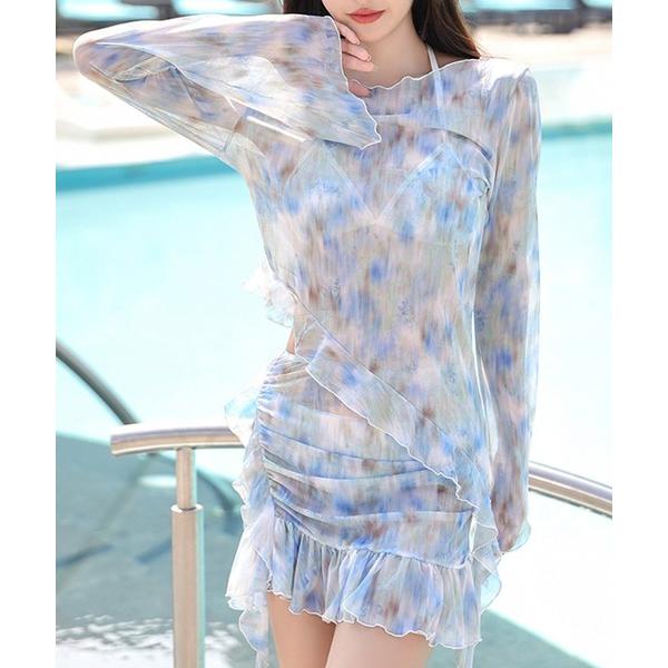 水着 レディース水着 ホルターネックタイダイビキニ+長袖シースルートップス+タイトフリルスカート 4点セット レディース
