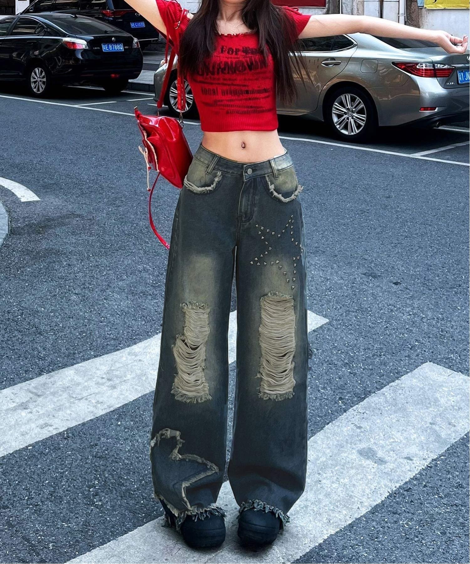 【SALE/55%OFF】MEMECLE MEMECLE/(W)【 MEMECLE / メメクル 】スターパッチフリンジデニムパンツ チェルカ パンツ ジーンズ・デニムパンツ ブルー
