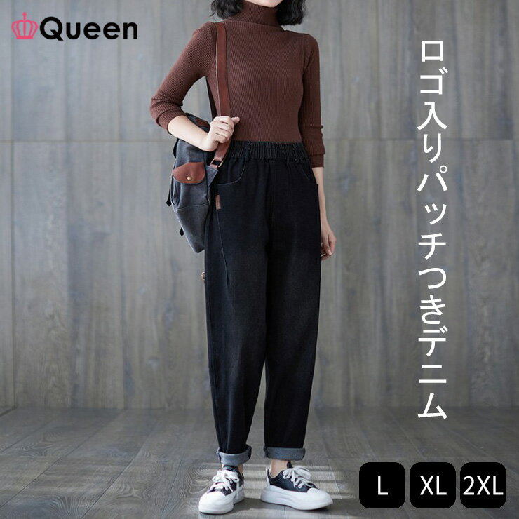 【期間限定50%OFF】大きいサイズ レディース デニムパンツ 黒 テーパード ボールパンツ 太ももゆったり ウエストゴム 春 秋 冬 L LL 3L ブラック 新入荷 メール便不可
