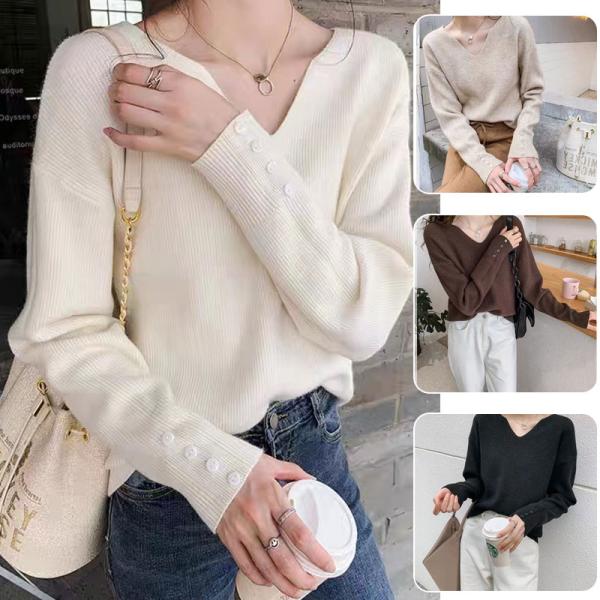 特価セール リブニット Vネック ニットセーター レディース トップス 長袖 無地 袖ボタン プルオーバー ゆるニット ネコポス送料無料 翌日配達対応