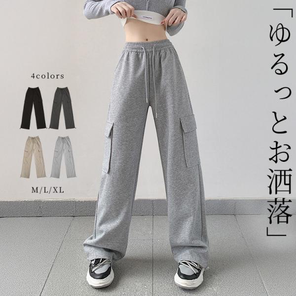 送料無料 翌日配達 あすつく「楽に旬なトレンドコーデに」スウェットパンツ レディース ボトムス ロングパンツ カーゴパンツ ズボン ハイウエスト ゆったり ウエストゴム 紐 ポケット...