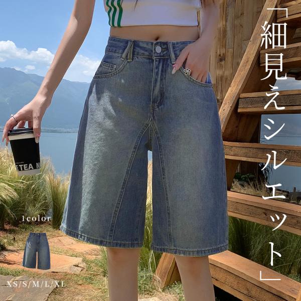 バミューダパンツ レディース デニム ボトムス ワイドパンツ ハーフパンツ デニムパンツ ひざ丈 ヴィンテージ加工 ボタン 薄手 無地 春 夏