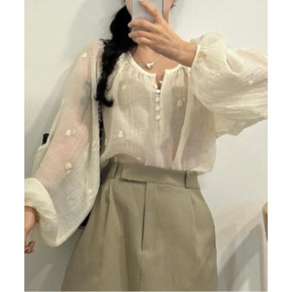 ブラウス シャツ フラワー刺繍クリンクルスモックブラウス レディース