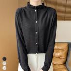 レディース ニットブラウス 透かし編み トップス きれいめ フリルネック スタンドカラー フリル