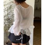 ブラウス シャツ ソリッドカラー ラウンドネック シアー フレアスリーブ プルオーバー レディース