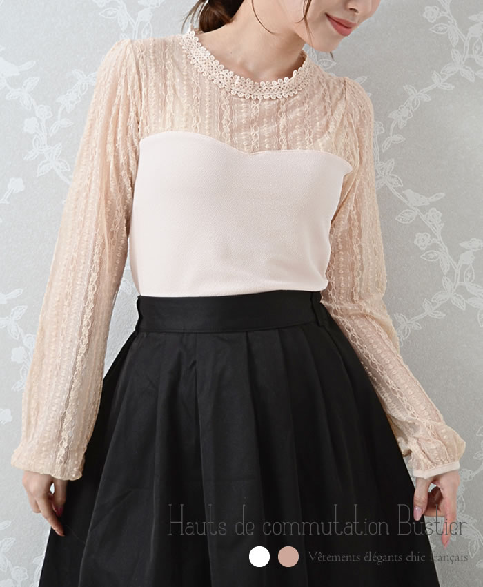 ★50%OFF★ トップス 【ゆうメール便送料無料】 スタンドカラー ブラウス レディース 長袖 カットソー パフスリーブ レース 大人 可愛い きれいめ プチプラ ( レーススリーブビスチェ切替長袖トップス )[カービーズ]