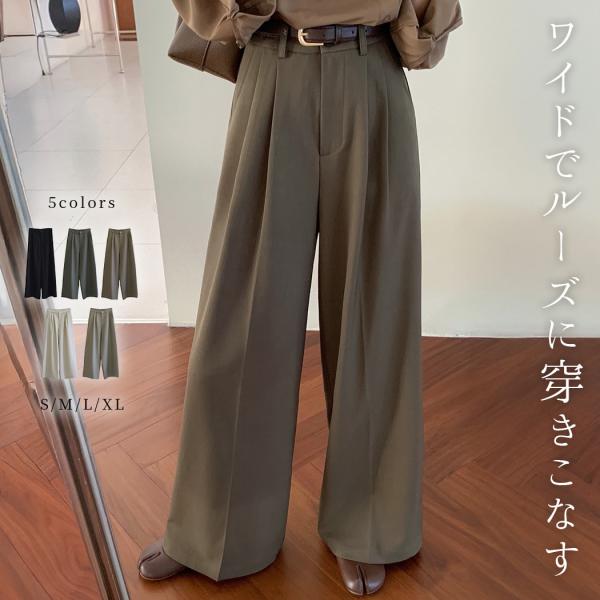 スラックス レディース ボトムス ズボン ワイドパンツ ロング丈 ロングパンツ ハイウエスト ボタン ファスナー 女性 薄手 無地 黒 春 夏 秋