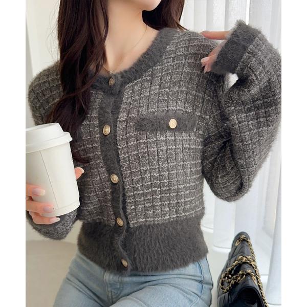 カーディガン 「mily bilet」ツィードライクフェザー切り替えラメニットジャケット レディース