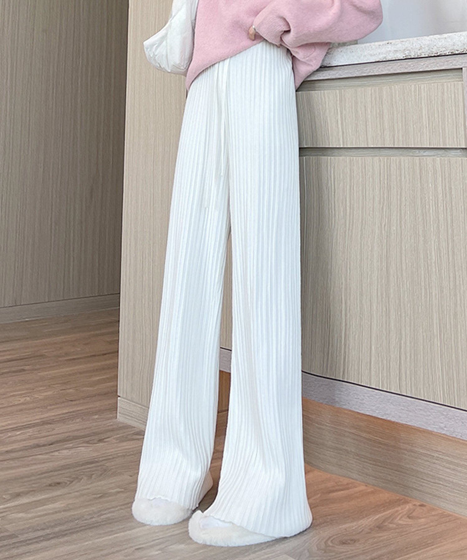 パンツ 「マシンウォッシャブル/アンチピリング」サイドフリンジ ワイドストレート リブニットパンツ レディース