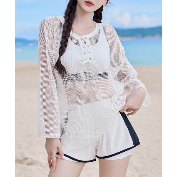 水着 シアー長袖トップス+ハイウエスト キャミソールビキニ 水着 3点セット レディース