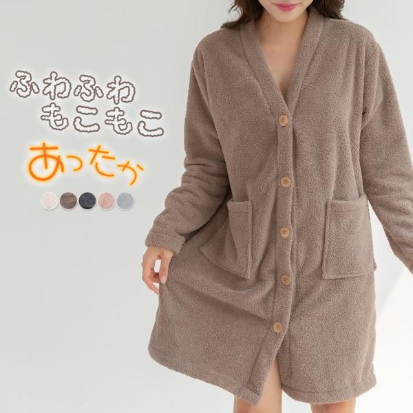送料無料 翌日配達 あすつくルームウェア カーディガン ワンピース レディース 長袖 もこもこ 前開き 起毛 ふわふわ トップス パジャマ ミディアム丈 羽織り 無地 Vネック フロントボタ...