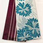 美品 半幅帯 優品 菊 縞 青緑 化繊 中古