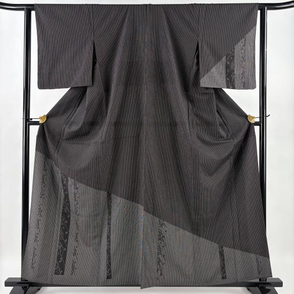 美品 付下げ 身丈161cm 裄丈62.5cm S 単衣 紬地 枝葉 縦縞 黒 正絹 秀品 中古