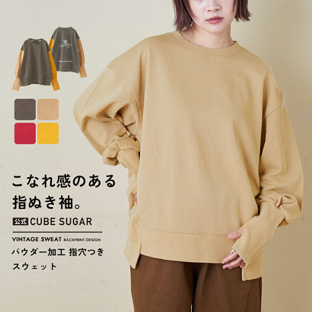 【クリアランス★50%OFF】スウェット / 公式 CUBE SUGAR 32s裏毛 パウダー加工 スウェット 指穴つき プルオーバー (5色): アメカジ レディース トップス トレーナー 長袖 バックプリント リブ 古着風 スエット カジュアル キューブシュガー