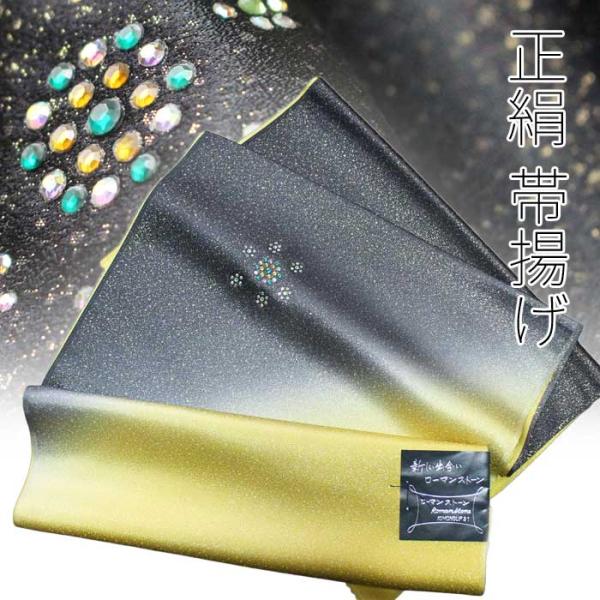 絹100% 長さ 約180cm 菜種色と黒のグラデーションに、 ワンポイントのラインストーンが施されています。 結ぶと左右どちらかの胸の下あたりにラインストーンがきます。豪華で華や...