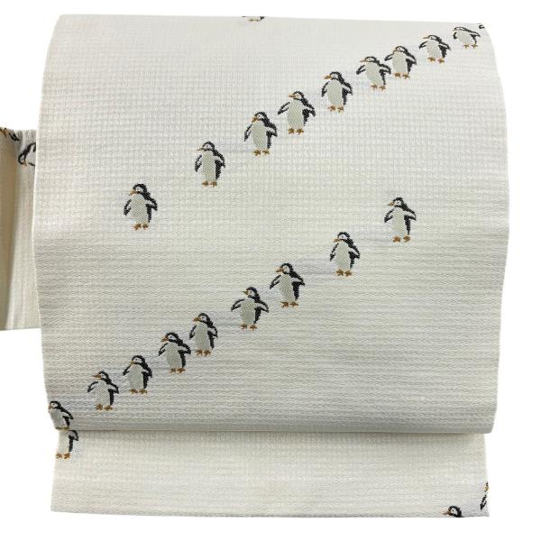 美品 名古屋帯 逸品 ペンギン 刺繍 白 正絹 中古